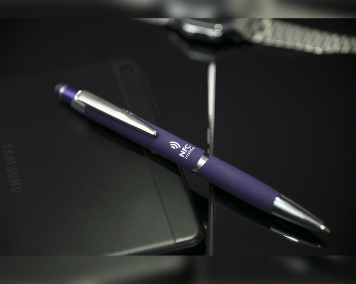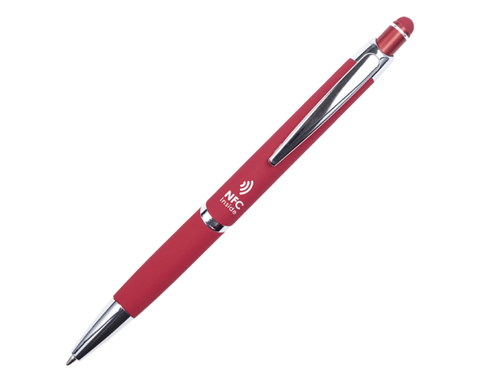 ZANTY - Bolígrafo de aluminio con acabado de goma suave al tacto y detalles en cromo. Cuenta con touch screen en la parte superior del color del bolígrafo y mecanismo de click. Al grabar destapa en color plata. Repuesto en tinta negra alemana de 1 mm. Tiene una etiqueta NFC en su interior que enlaza la información rápidamente a la aplicación de NFC, compatible con todos los celulares Android e iOS que cuenten con esta aplicación disponible.