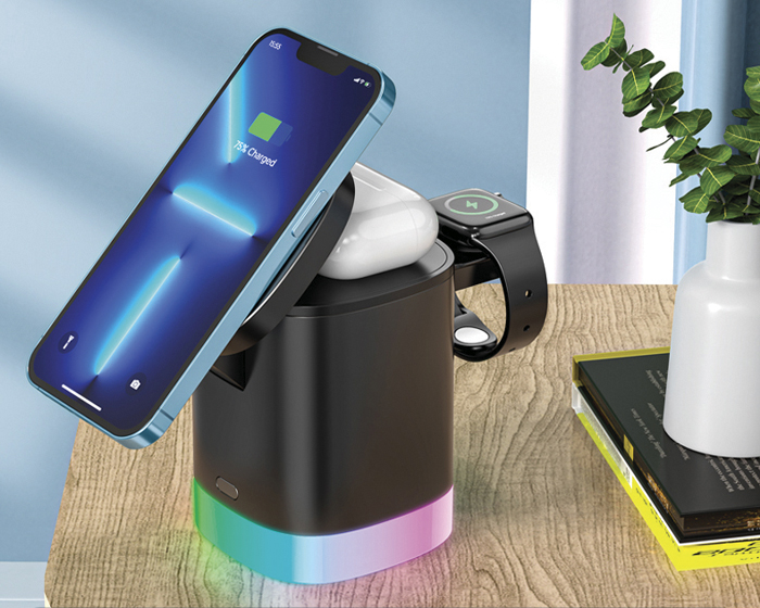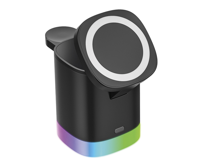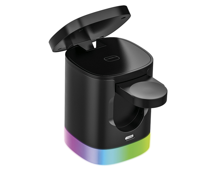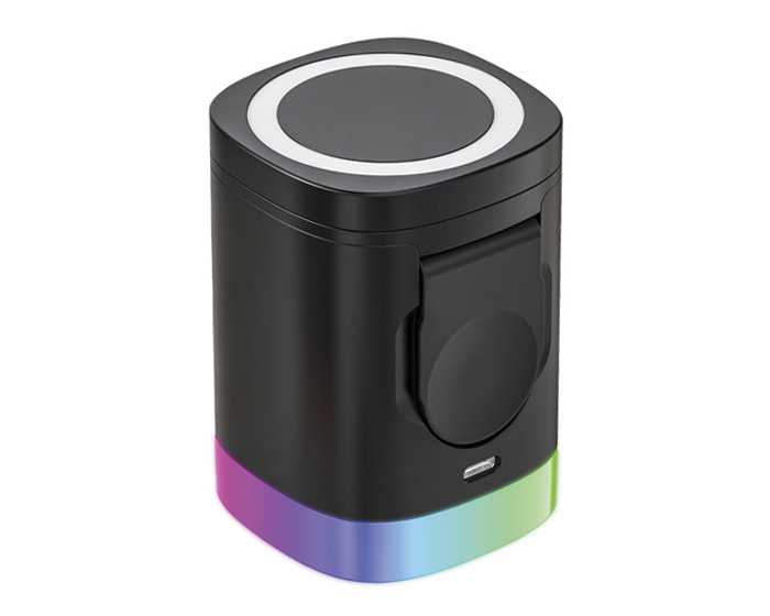 PEKIN - Apple WatchCargador magnético inalámbrico de carga rápida Qi (15W) 3 en 1 para dispositivos electrónicos. Incluye: compartimento de carga para celular (15W), reloj inteligente (3W Carga solo dispositivos Apple Watch) y audífonos (5W), cuenta con base para Apple Watchy dispositivo móvil plegable, luz LED multicolor, botón de encendido/apagado que funciona como modelador de la luz LED. Puerto de carga tipo C. Incluye cargador. Compatible con dispositivos iOS. Presentación: caja de regalo a color. (Verifique la compatibilidad con sus dispositivos móviles).