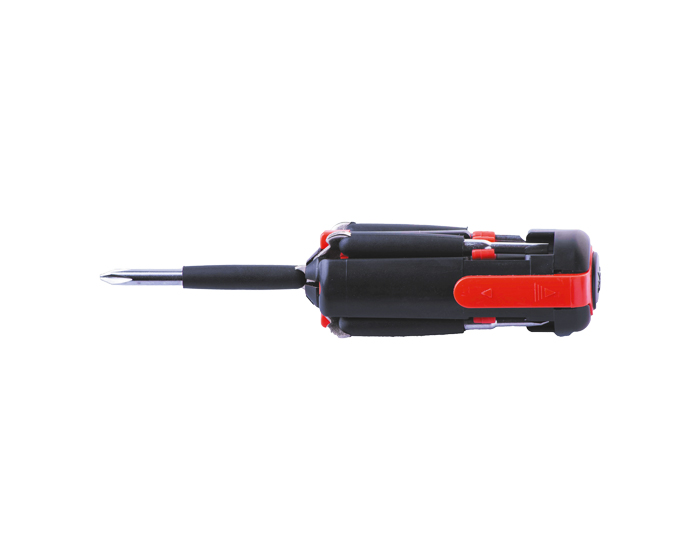 DYNAMIC - Desarmador con lámpara todo en uno, cuerpo de plástico, con botón encendido/apagado, 5 puntas diferentes y 4 LEDS. Cuenta con mecanismo de bloqueo para seguro de los desarmadores. Fácil de usar y transportar. Utiliza 2 baterías AAA (no incluidas). Presentación: caja en color blanco.