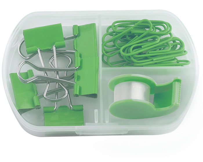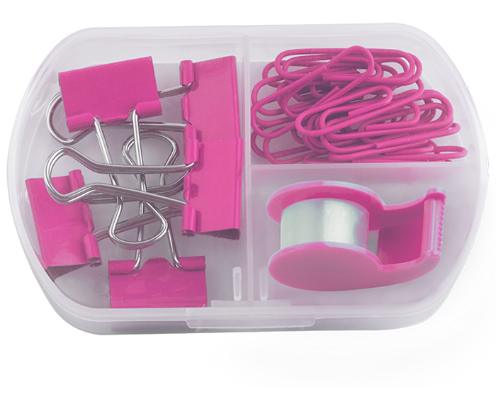 TRIM - Set de papelería que incluye mini despachador de cinta adhesiva, 5 clips sujeta documentos y 20 clips para papel. Presentación: estuche de plástico transparente.