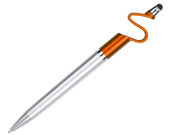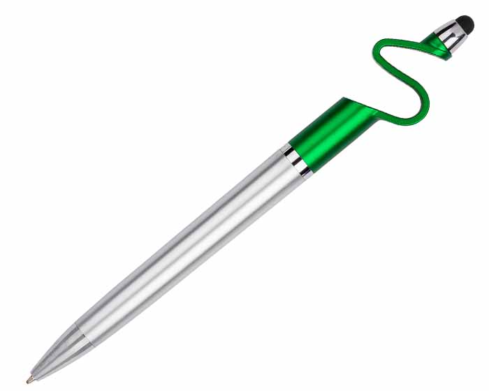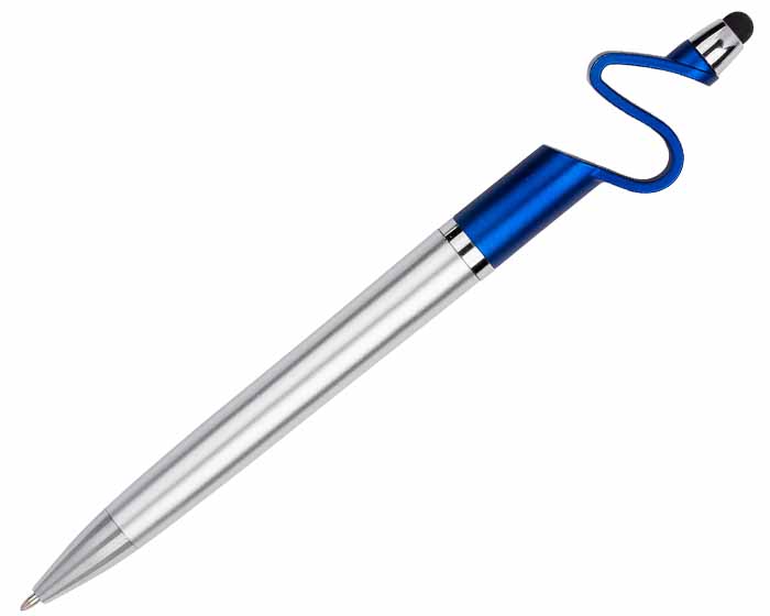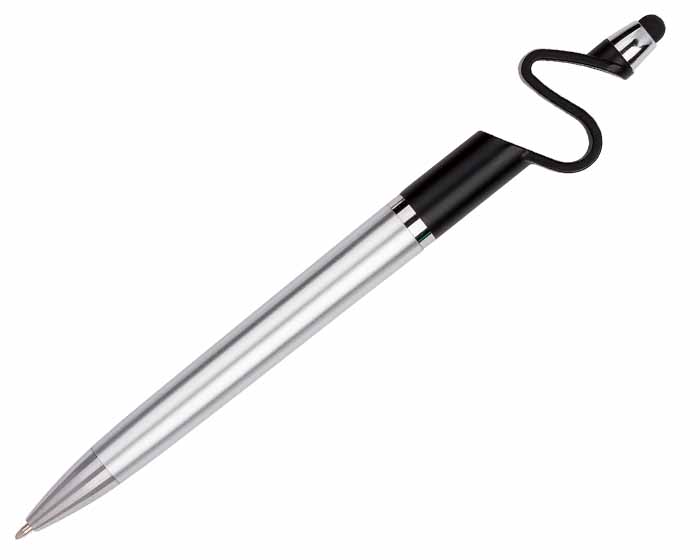 HOLDER - Bolígrafo de plástico con cuerpo color plata. Su forma en “s” está diseñada para utilizarse como base para teléfono celular. Punta touch para pantallas táctiles. Mecanismo retráctil.