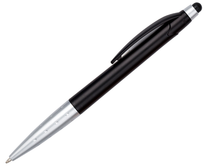 TAU - Bolígrafo de plástico con apariencia metálica. La parte inferior está diseñada en color plata que lo hace lucir con gran estilo al contar con pequeñas hendiduras en forma oval para una mejor sujeción. Touch en color negro. Mecanismo retráctil.