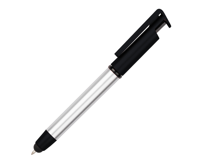 ADAM - Bolígrafo de plástico, apariencia metálica con función dual de puntero para dispositivos touch; pantalla plegable integrada para limpiar dispositivos móviles. Tapa extraíble diseñada para usarse como base de teléfono celular. Mecanismo retráctil.