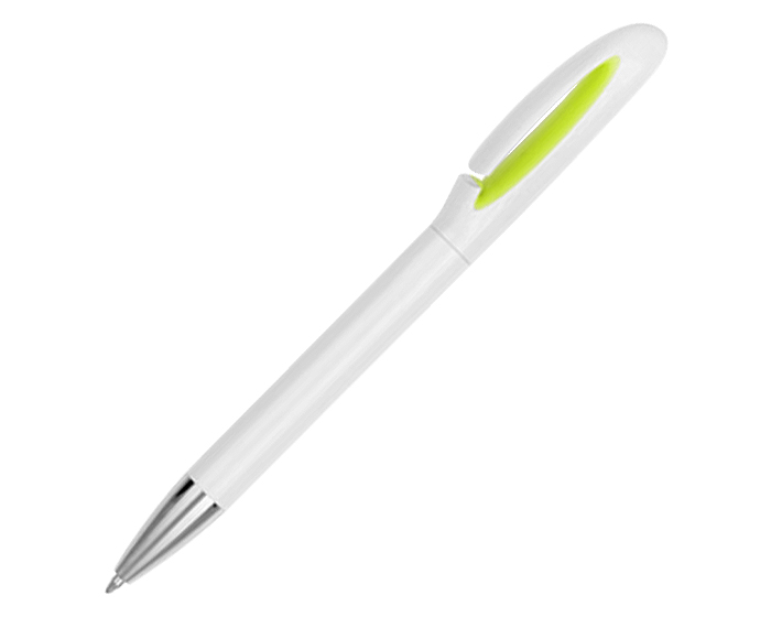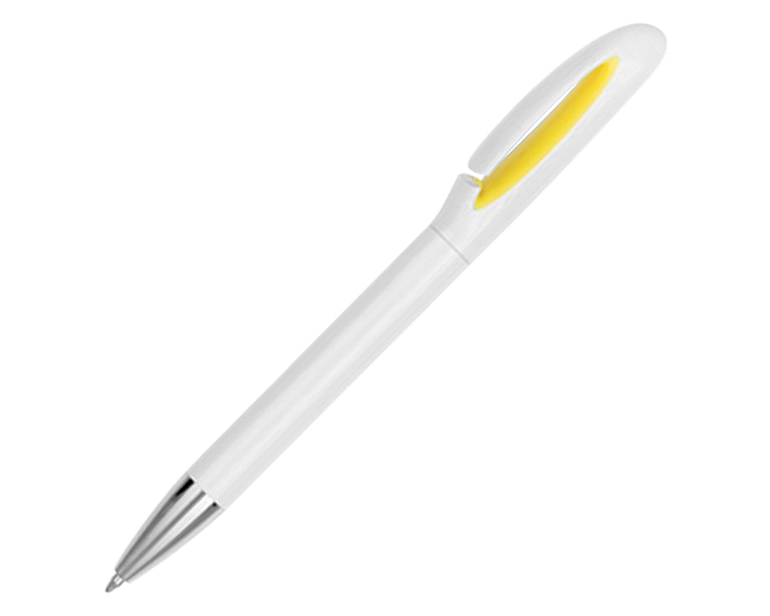 NADIA - Bolígrafo plástico de cuerpo blanco con punta cromada. Novedoso diseño de clip con detalle en color. Ligero y cómodo. Mecanismo retráctil.