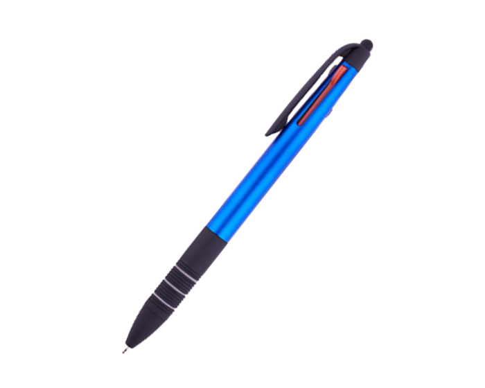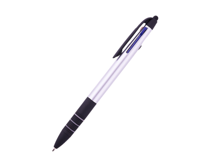 MULTIPEN - Bolígrafo plástico con terminado metalizado. Tiene integradas 3 tintas: negra, roja y azul. Parte inferior con goma antideslizante en negro con detalles de arillos en gris. Cuenta con touch para dispositivos táctiles. Mecanismo deslizante para cambio de tinta.