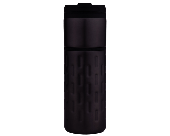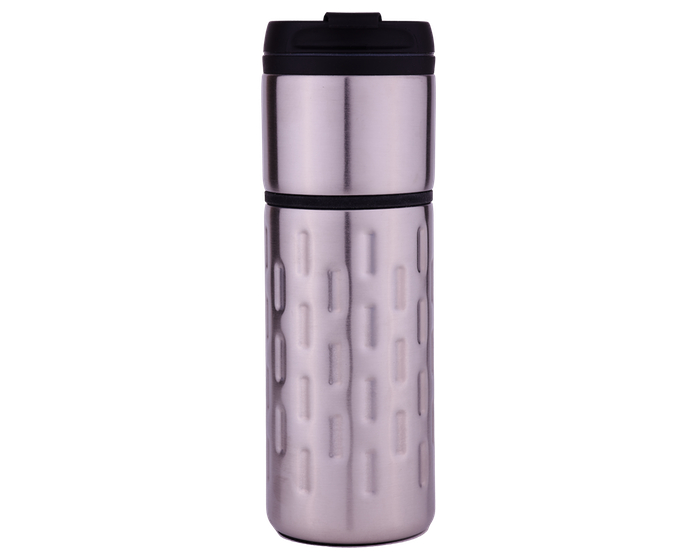 MANZUR - Termo metálico de acero inoxidable con interior de plástico. Tapa de rosca hermética abatible con boquilla y hendidura, para beber cómodamente los líquidos sin que se derramen. Cintillo intermedio de silicón. Cuerpo diseñado con finos detalles en relieve que le dan un toque elegante y de presencia. CAP. 470 ml. Presentación: caja en color blanco.