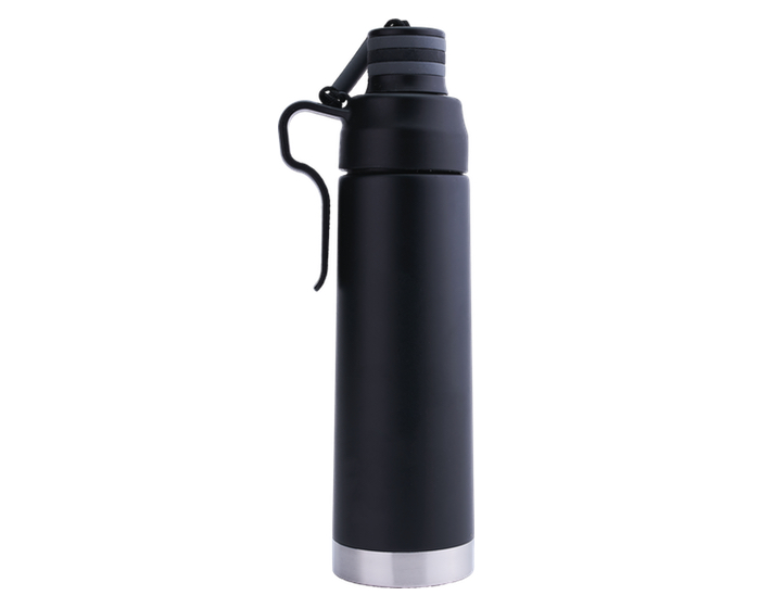 KUO - Termo de acero inoxidable con acabado mate y practica asa metálica para sujetarlo fácilmente o para colgar en la mochila. Cuenta con boquilla para tomar cómodamente las bebidas y con tapa de rosca amplia para vaciar líquidos fácilmente. El diseño tiene detalles decorativos con banda y correa de silicón en color. CAP. 540 ml. Presentación: Caja en color blanco.