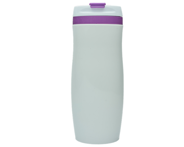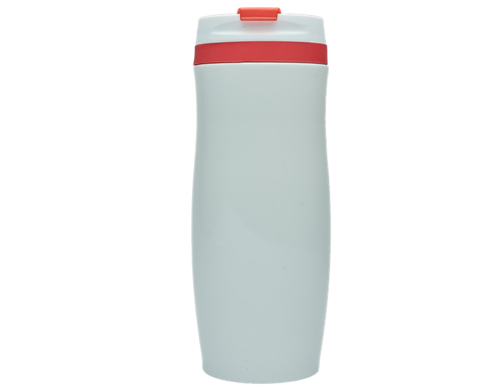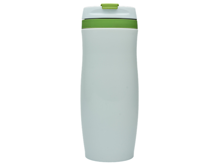 ZEKI - Termo metálico con diseño ergonómico, con acabado en esmalte blanco y banda superior de silicón en color. Cuenta con interior en acero inoxidable, tapa de rosca hermética, seguro para líquidos con bisagra en color y goma anti derrapante en la base. CAP. 400 ml. Presentación: caja en color blanco.