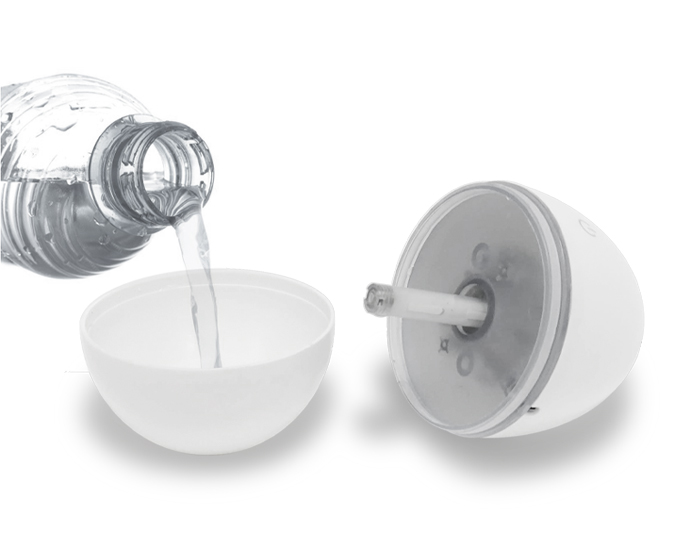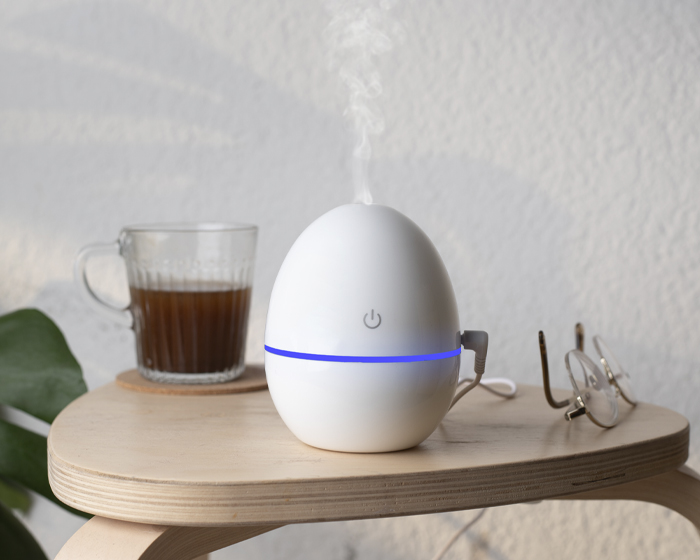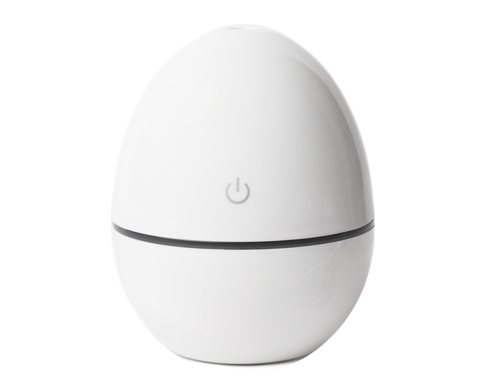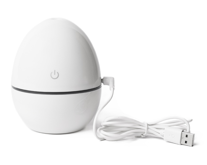 ZEN - Humificador ultrasónico (sin sonido) en forma de huevo giratorio a 360° con luz LED en color azul y botón touch para encender y apagar. Cap. 200 ml. Incluye cable de carga USB. Presentación: Caja de regalo a color.
