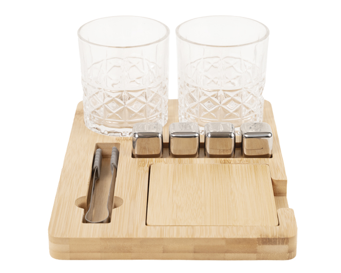 CHICAGO - Set para whisky que incluye: 2 vasos de cristal, pinzas de acero inoxidable con puntas de silicón, 4 hielos de acero inoxidable y 2 portavasos y base de bambú para colocar los accesorios. Presentación: Caja en color negro.