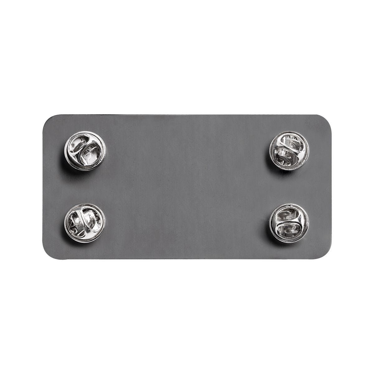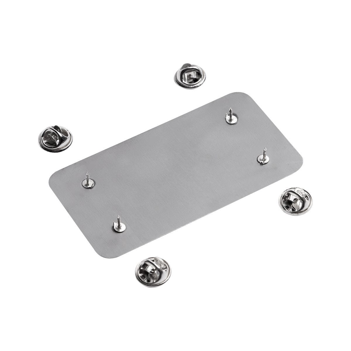 PLACA METÁLICA CON GRABADO MD - Placa metálica para grabado mediana. Incluye 4 pines de presión, mica adherente protectora y bolsa individual. Grosor máximo de encaje 5 mm. Disponible a la venta únicamente en la compra de algún producto textil de catálogo. El precio incluye el grabado de un logo y una posición. Mínimo para grabado de 50 piezas. No aplica grabado personalizado.