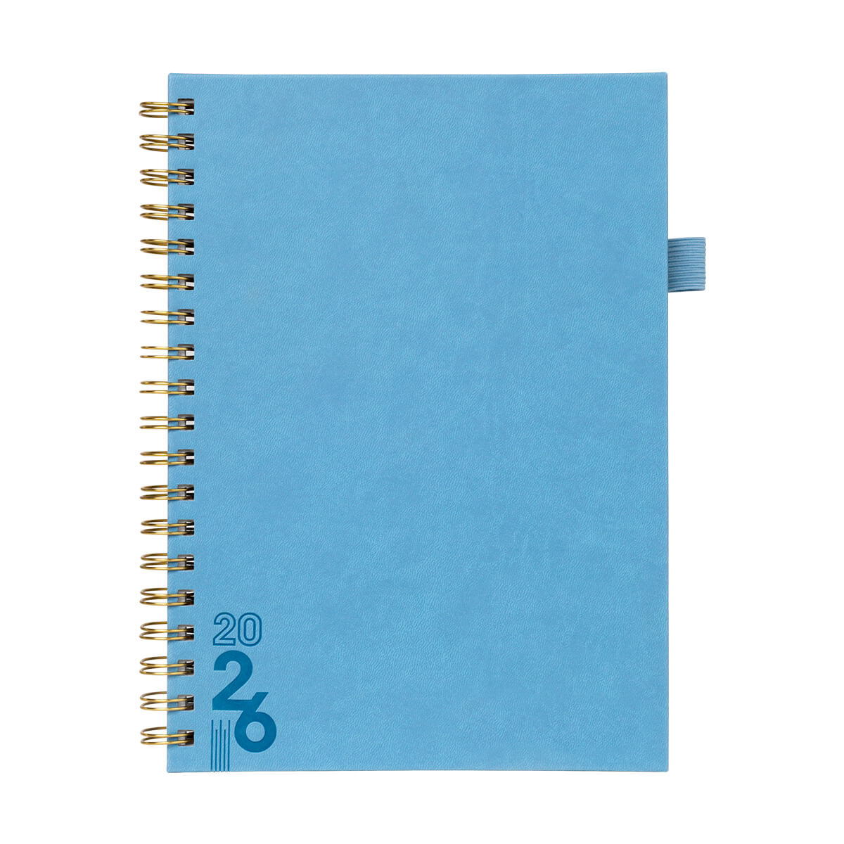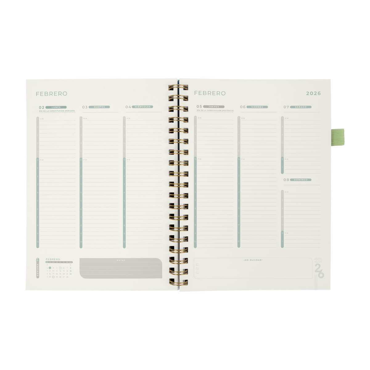 AGENDA SEMANAL TERRA 2026 - Agenda semanal con 80 hojas. Contiene datos personales, calendarios 2025-2026-2027, planeador 2026, seguimiento de nuevos hábitos, organizador de tareas, planeador de proyectos y días festivos. Incluye caja individual del mismo color a la agenda y bolígrafo.