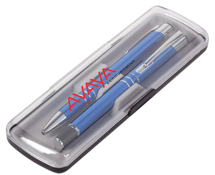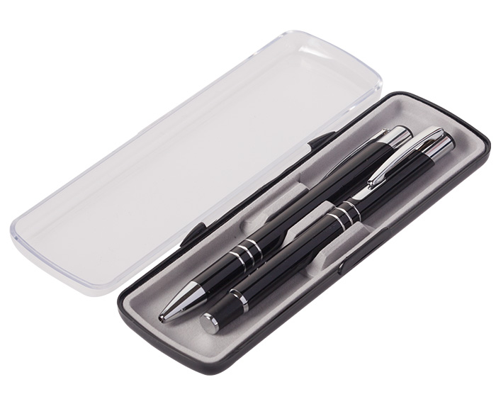 SYMPHONY - Set de bolígrafos metálicos de tinta negra. Un bolígrafo de punto fino tipo roller con tapa y un bolígrafo con mecanismo de click. Incluye estuche plástico de forro aterciopelado en color gris y tapa transparente para la impresión de logotipo.