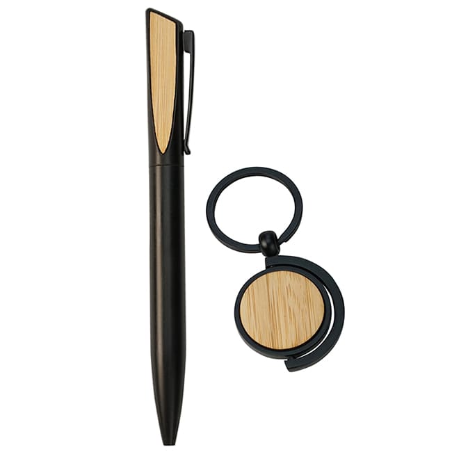 MATERIAL: Metal con terminado en lámina de bamoo MEDIDAS: Bolígrafo : 14 x 1.2 cm. Llavero : 7.5 x 3 cm diámetro MED. EMPAQUE: 38 x 30 x 49 PESO EMPAQUE: 12.2 kgs PIEZAS EMPAQUE: 100 pcs