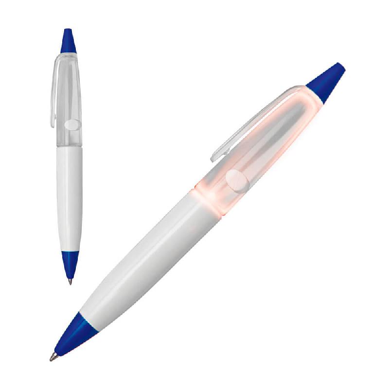 Bolígrafo con flotante interno en forma de pastilla. Cuenta con luz que se activa al escribir. Medidas: 15.3cm x 1.7 cm Material: Plástico.