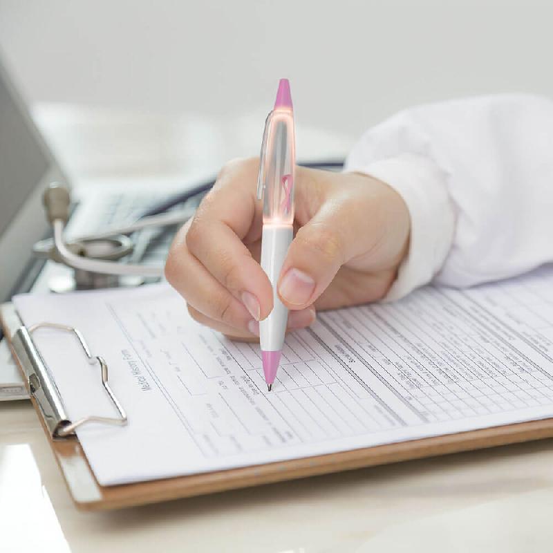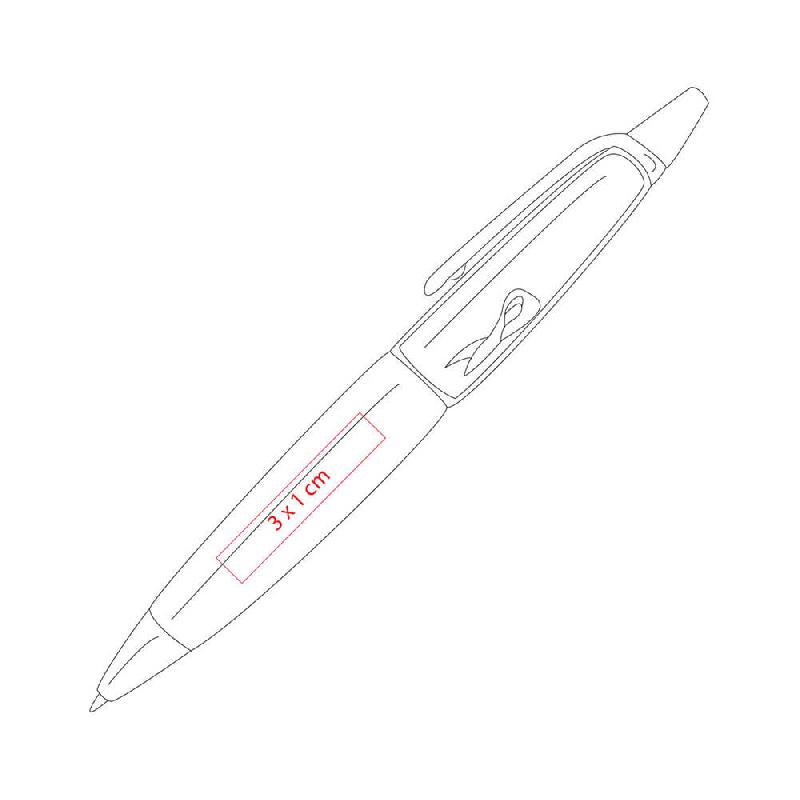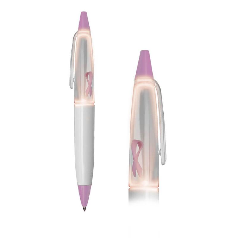 Bolígrafo con flotante interno en forma del emblema contra el cáncer. Cuenta con luz que se activa al escribir. Medidas: 15.3cm x 1.7 cm Material: Plástico.