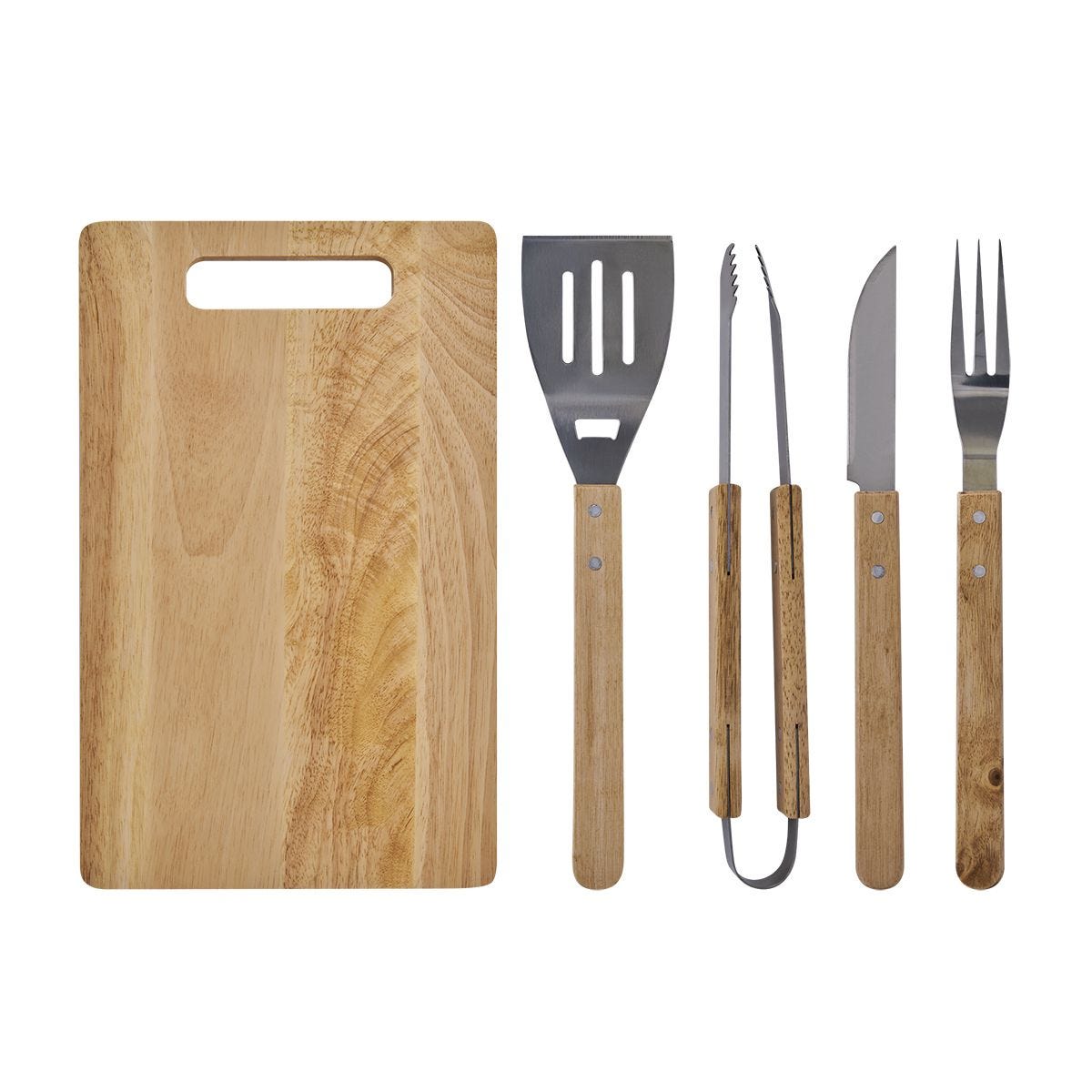 MATERIAL: Acero Inoxidable y Madera Caucho Utensilios / Poliéster Estuche MEDIDAS: 42.5 x 28 cm IMPRESION: Serigrafía MED. EMPAQUE: 43 x 41.5 x 27 cm PESO EMPAQUE: 1.18 Kg PIEZAS EMPAQUE: 8