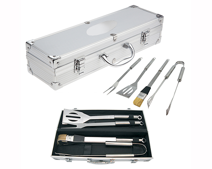CROME - Estuche de aluminio con juego de BBQ. Incluye: tenedor, volteador, pinzas y brocha. Presentación: caja en color blanco.