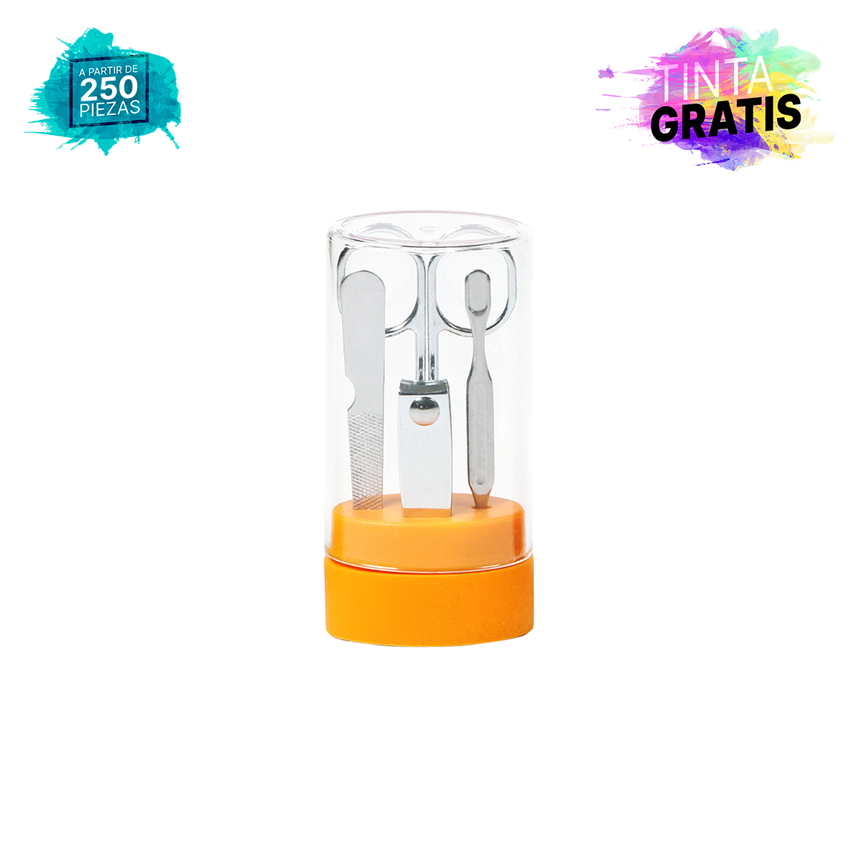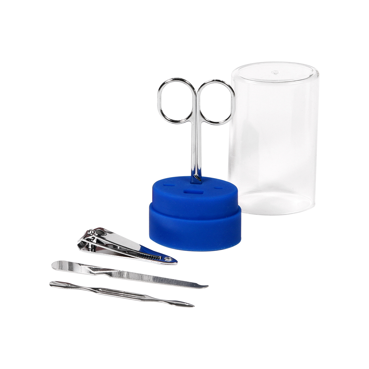 Set de manicura Lhasa. - Set de manicura en estuche ovalado de plástico transparente, con base de color, con 4 piezas (cortaúñas, empujador de cutículas, lima de metal y tijeras).