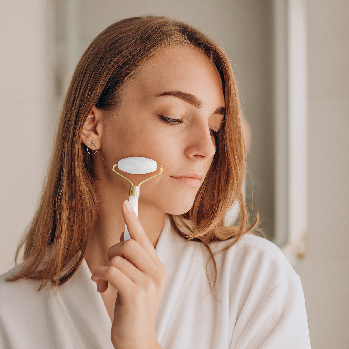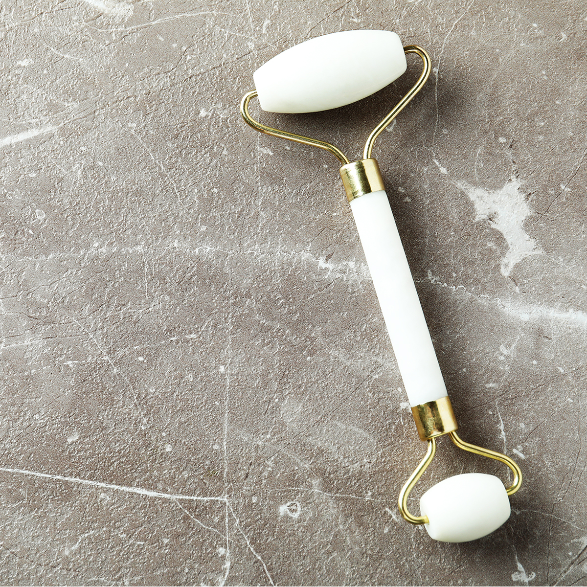 Set masajeador Bakel - Rodillo de cuarzo blanco para masaje facial con bolsa de tela.  El rodillo de cuarzo para masaje facial es una herramienta versátil y elegante que puede contribuir a mejorar la salud y la apariencia de la piel del rostro. Su estuche de tela es ideal para mantener el rodillo limpio y protegido cuando no está en uso.