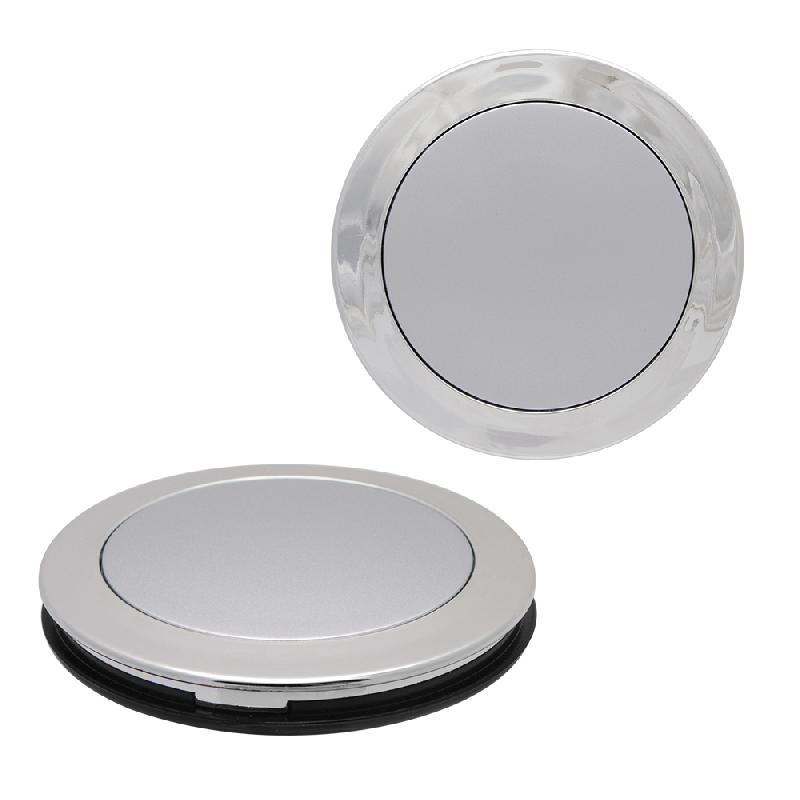 Espejo dual con acabado metálico, una de las caras con aumento. Medidas: 7.5 cm Diametro x 1 cm Material: Plástico.