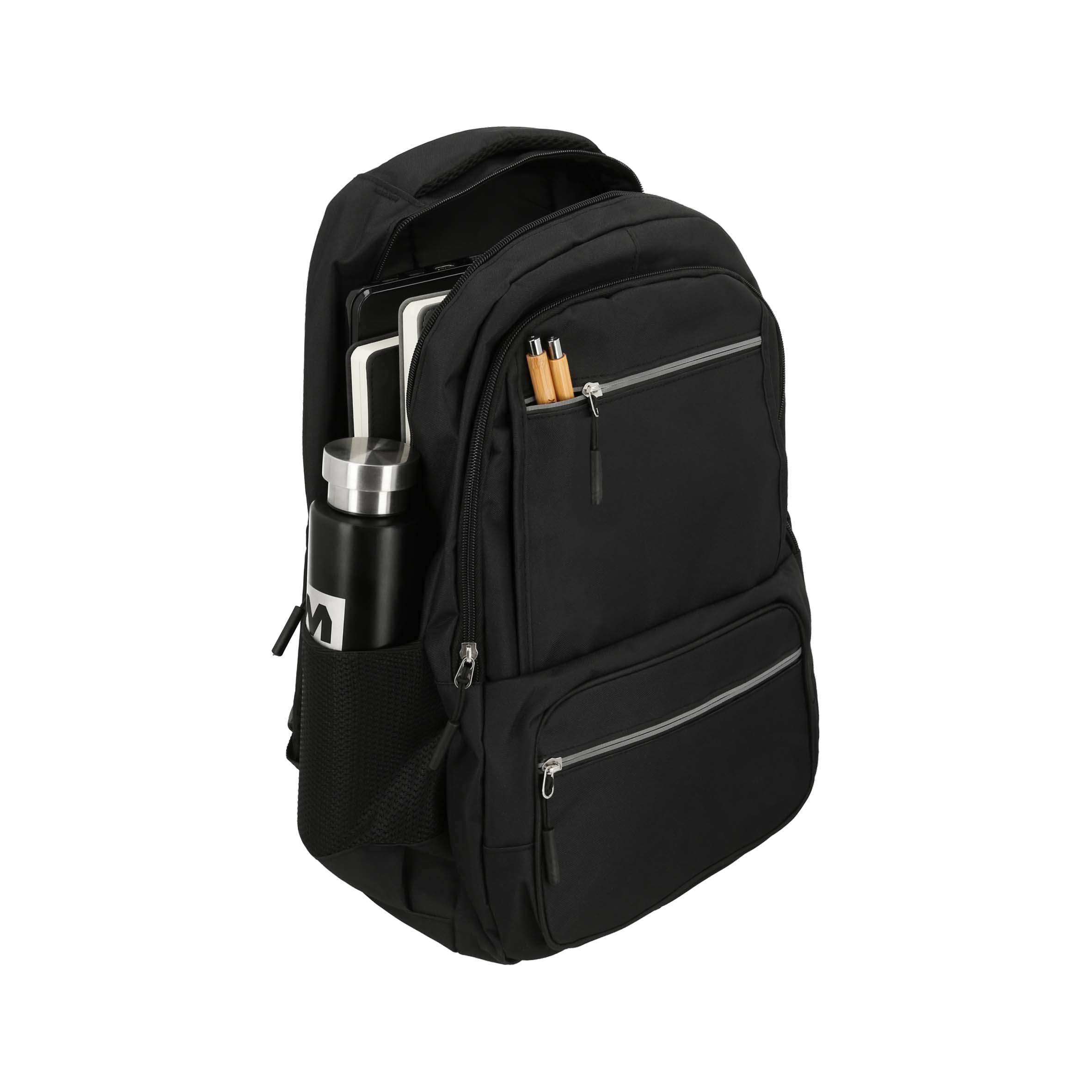 ATENAS Mochila con 4 compartimentos, 1 compartimento principal con apartado para laptop de 19", 3 compartimentos frontales y 2 bolsas de malla laterales.