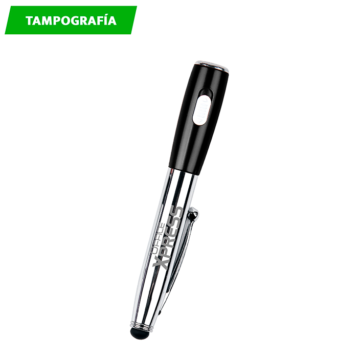 Bolígrafo de plástico Porto. - Bolígrafo fabricado en plástico ABS con tinta negra, que incorpora apuntador touch y lámpara. Combina funcionalidad, innovación y practicidad en un solo accesorio.