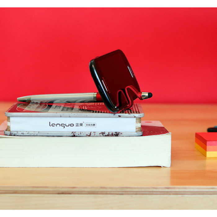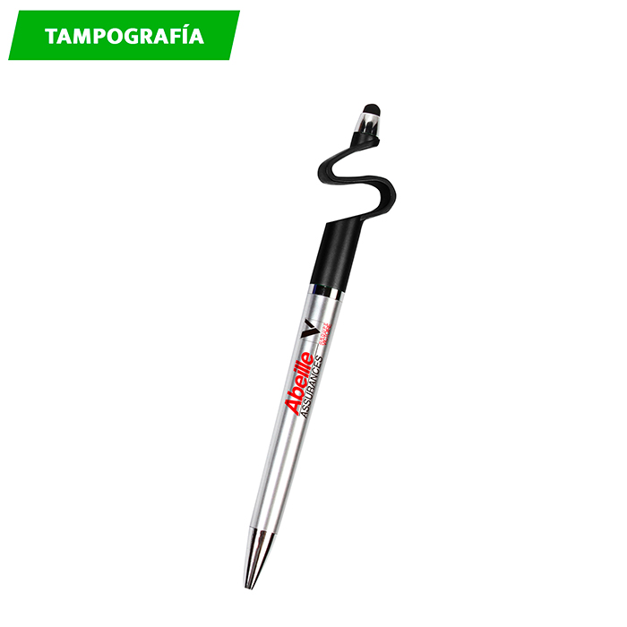 Bolígrafo de plástico Liverpool. - Bolígrafo de plástico con acabado metálico, puntero touch y base superior diseñada para sostener el celular. Tinta de escritura negra, combina funcionalidad y estilo.