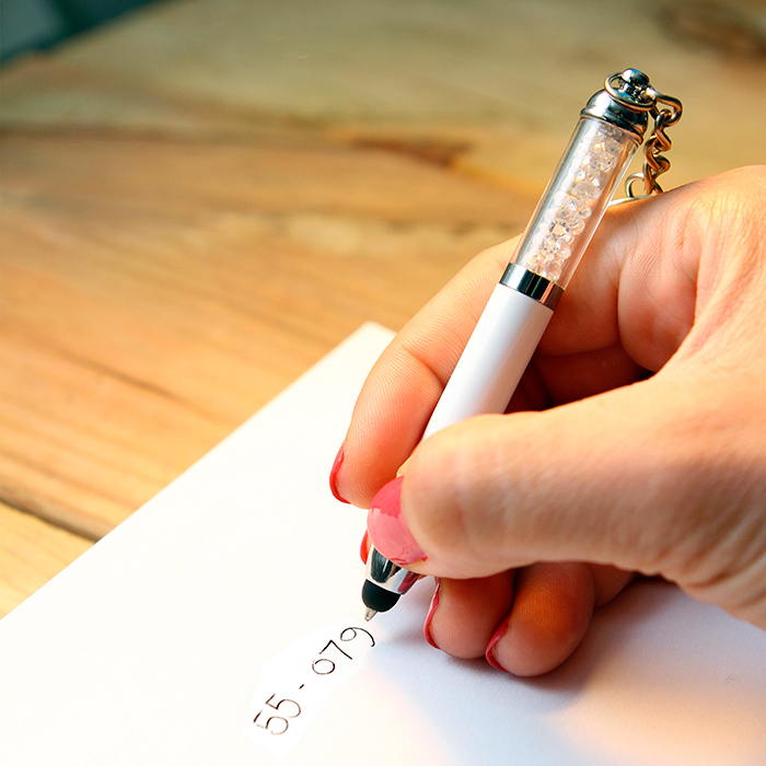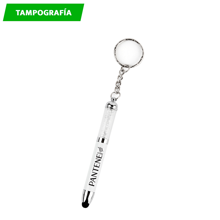 Bolígrafo mini llavero West. - Bolígrafo mini llavero con puntero touch y elegante detalle en piedras, con tinta negra. Compacto y práctico, perfecto para llevar a todas partes con estilo.