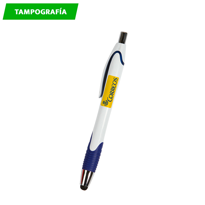 Bolígrafo de plástico Kashan. - Bolígrafo fabricado en plástico lo que le confiere durabilidad y resistencia, una de sus características principales es su puntero touch. Integrado en la parte superior, cuenta con un agarre de goma ergonómico lo que le proporciona una sujeción cómoda y firme. Utiliza tinta de escritura azul.