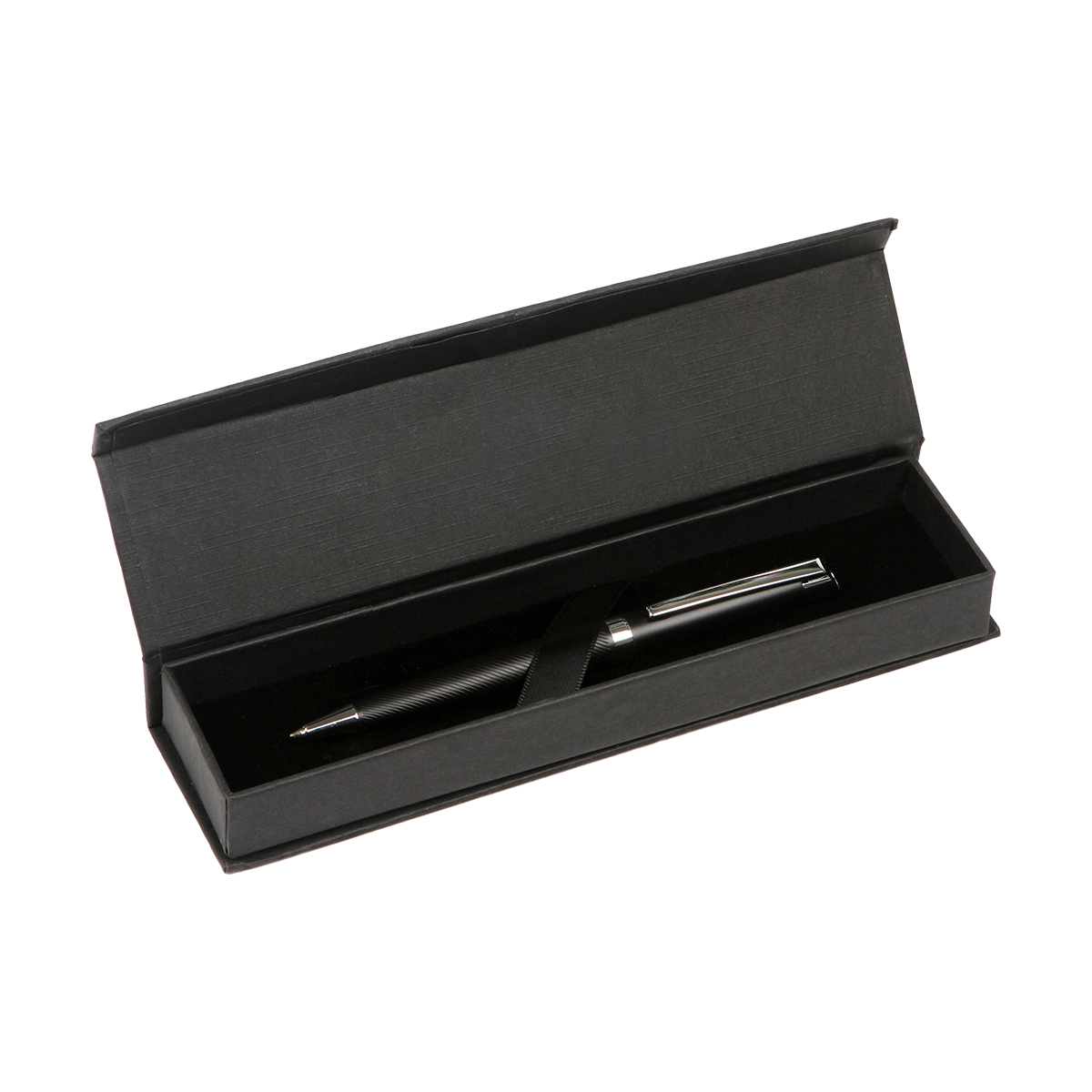 Bolígrafo Monza. - Bolígrafo metálico con detalles cromados en punta y clip, tinta de escritura negra. Incluye estuche individual.