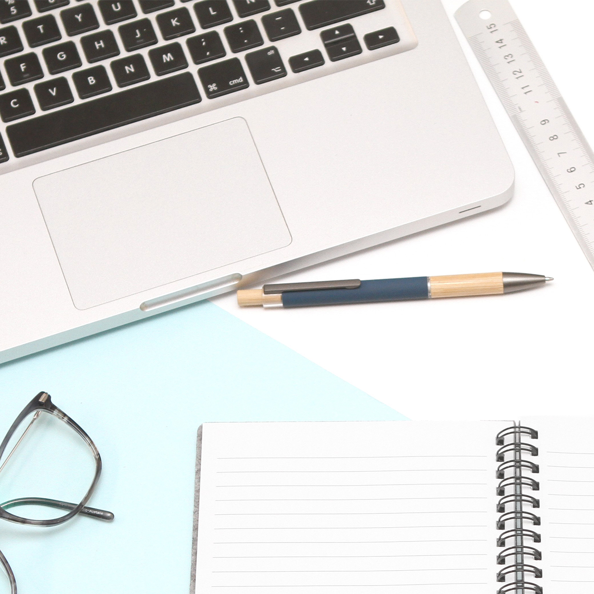 Bolígrafo Scai. - Bolígrafo de tinta azul, con mecanismo de botón, fabricado en aluminio, con clip metálico y detalles de bambú.