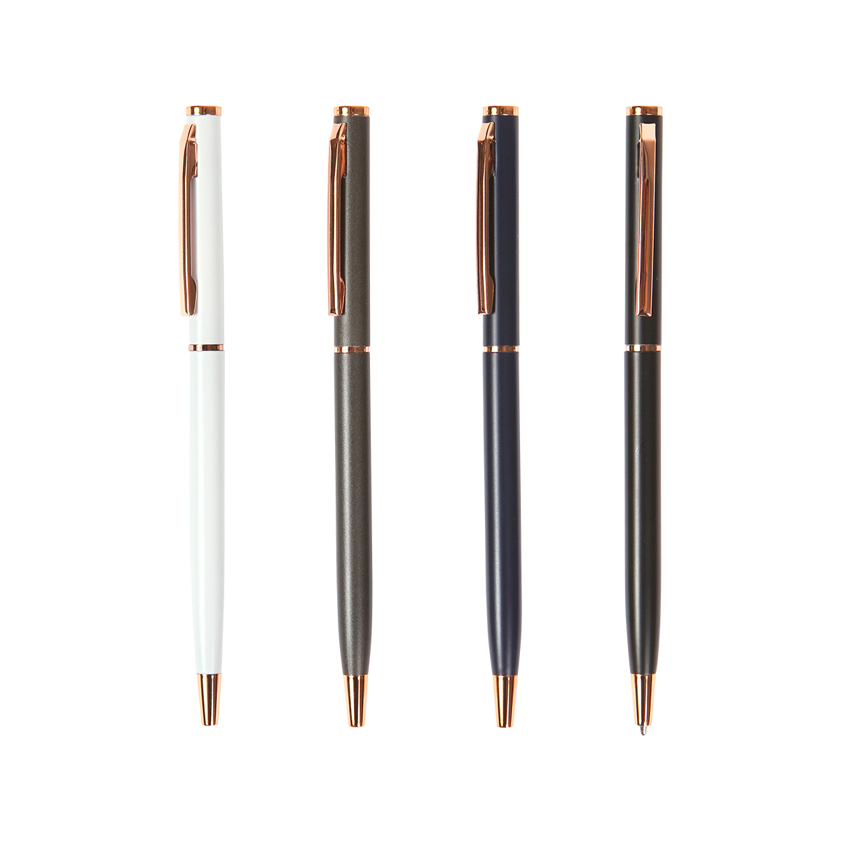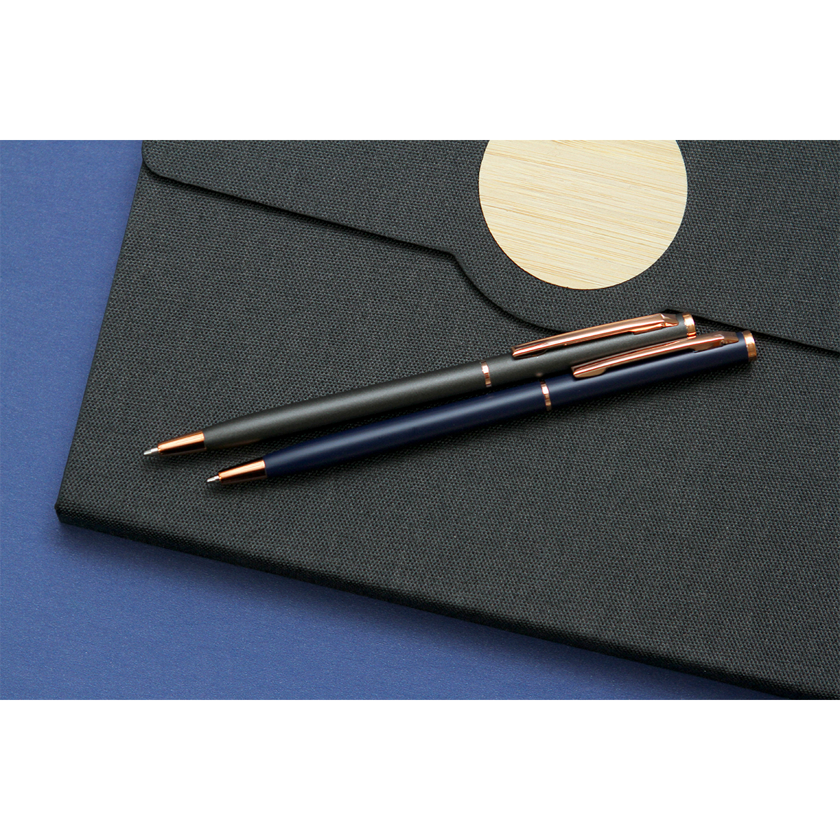 Bolígrafo Fontaneda. - Bolígrafo fabricado en aluminio con acción giratoria (twist). Barril de aluminio lacado. Clip, punta y aro medio de metal tipo oro rosa. Recarga cruzada de plástico. Tinta de escritura azul.