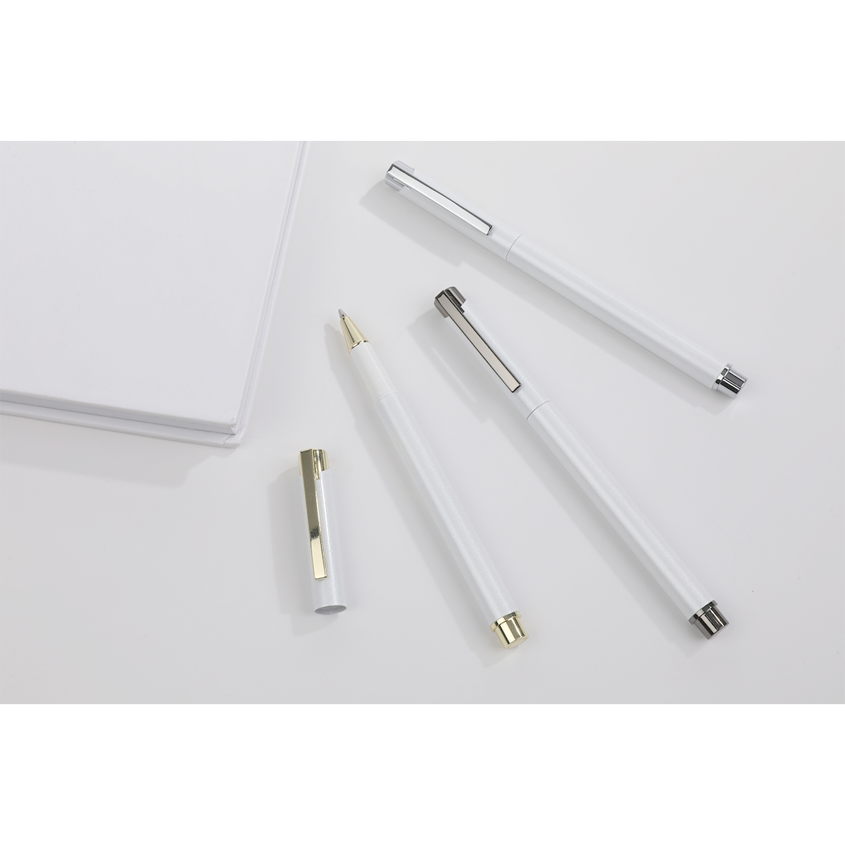 Bolígrafo Ramsau. - Bolígrafo de acción cap off, barril fabricado de de aluminio color blanco, clip y detalles galvanizados en tres colores diferentes. Incluye caja individual de cartón. Tinta de escritura negra.