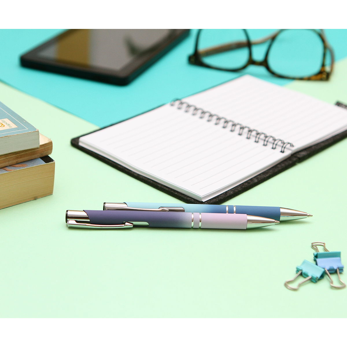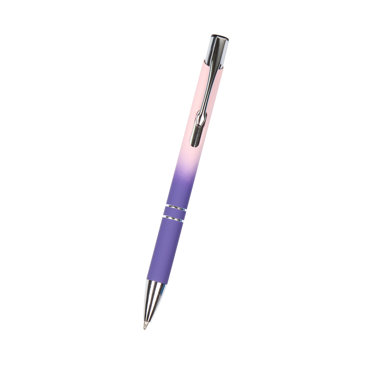 Bolígrafo Kongo. - Bolígrafo con barril de aluminio de color degradado con acabado de goma, 2 anillos en el barril, clip de metal cromado, botón y punta cromados, recambio Parker de plástico y tinta de escritura negra.