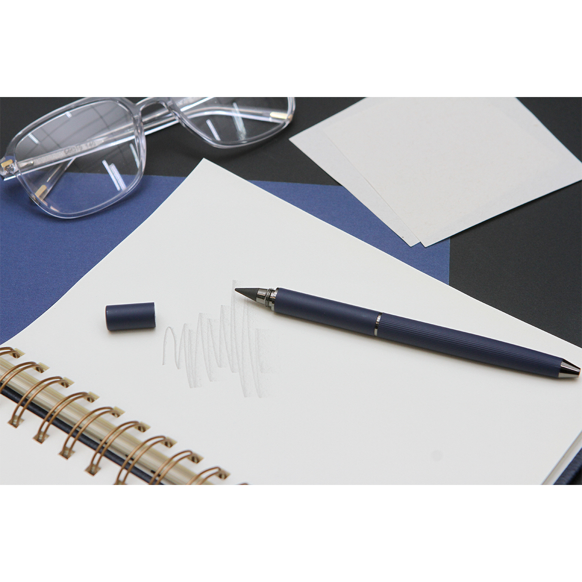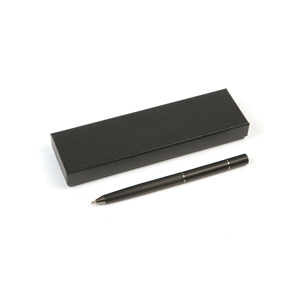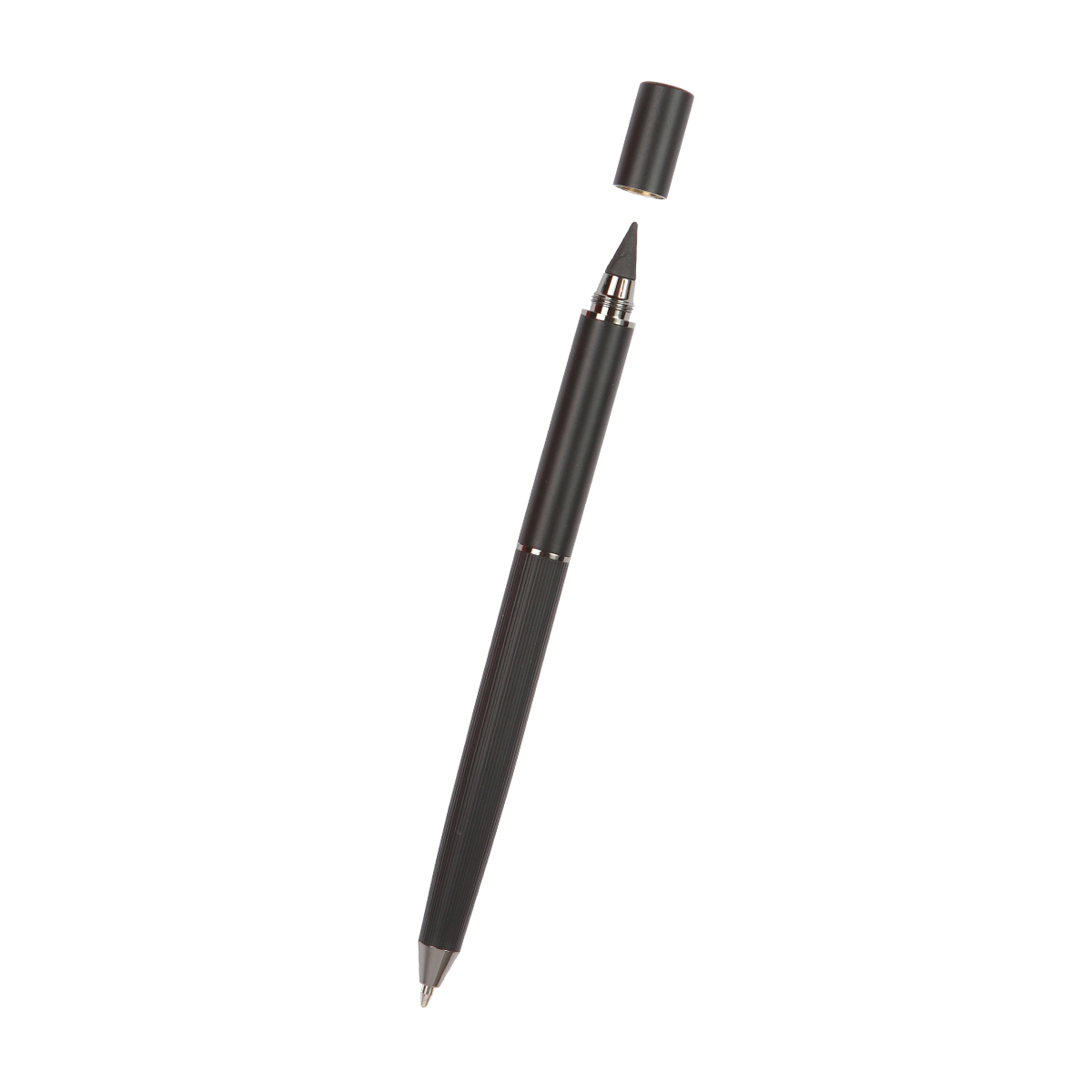 Bolígrafo Bais. - Bolígrafo dos en uno con barril fabricado en aluminio con acabados mate, tipo ball pen, tinta de escritura negra. Y del otro lado tiene la función de lápiz infinito. Incluye caja de regalo color negro.