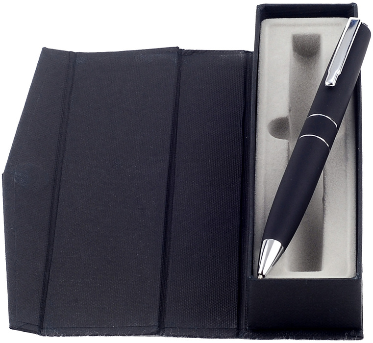 BOLÍGRAFO "LONDON II" Cuerpo metálico engomado. Destape electroplateado en la parte superior. Clip y detalles metálicos color plata. Tinta negra. Estuche con cierre magnético. Área de impresión: 0,8 x 5 cm. Presentación en estuche con cierre magnético.