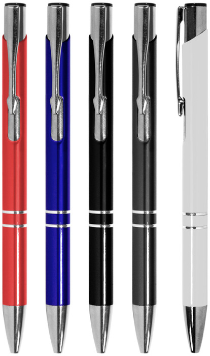 BOLÍGRAFO ¨BURMA¨ Cuerpo metálico de color. Clip, punta, y pulsador color plata. En el centro del bolígrafo cuenta con dos arandelas y más arriba finalizando el clip cuenta con una muesca color plata. Tinta negra