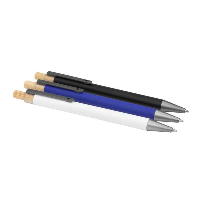 BOLÍGRAFO "VUMY". Bolígrafo retráctil. Cuerpo metálico en diferentes colores acabado mate. Clip metálico y puntera plástica color gris acabado mate. Pulsador de bambú. Tinta negra.