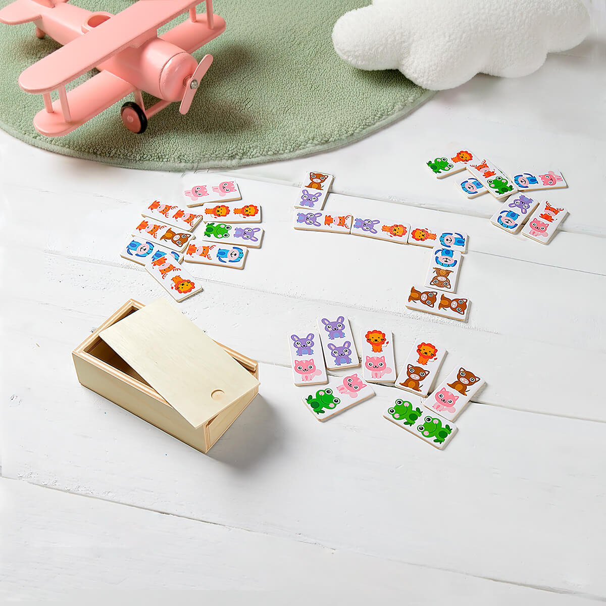 DOMINÓ LAHTI - Incluye 28 fichas con adorables ilustraciones de animalitos. Ideal para estimular la memoria, el reconocimiento visual y la lógica de forma entretenida. Viene en una práctica caja de madera que facilita su almacenamiento y transporte. La madera es un producto natural el cual puede presentar variaciones en tonalidades y vetas. Incluye caja Individual.