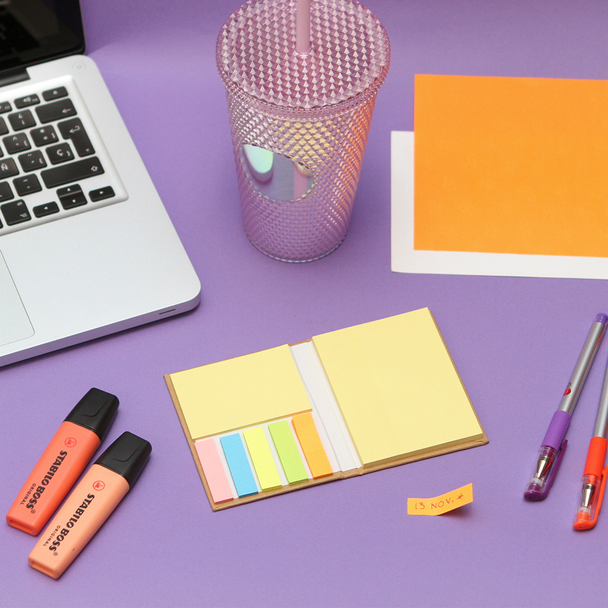 Libreta ecológica Kuala. - Libreta ecológica de pasta rígida con notas adhesivas en color amarillo y banderitas de colores adhesivas.