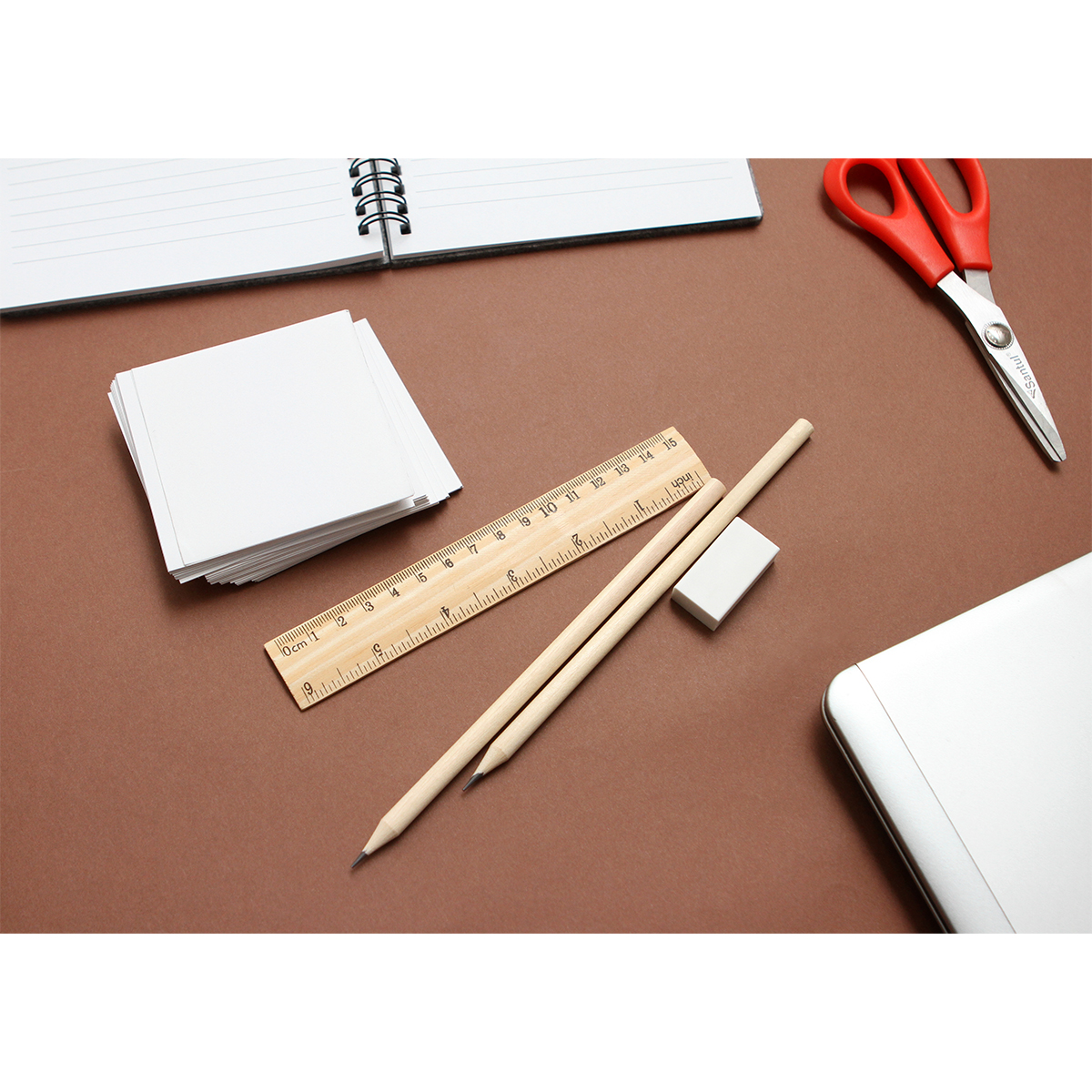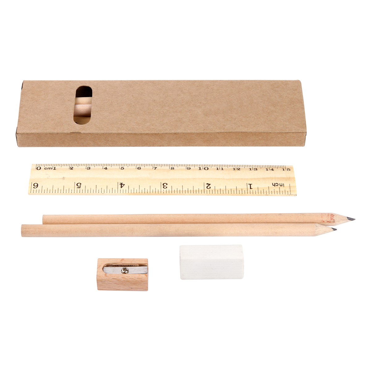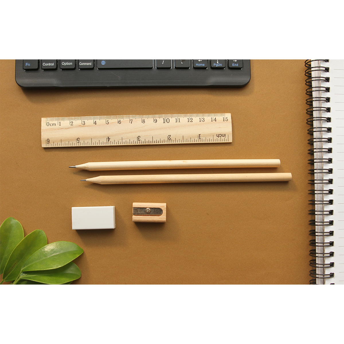 Set ecológico Atlantis. - Set escolar ecológico con goma, 2 lápices, regla de madera con 15 cm y sacapuntas de madera. Este conjunto ofrece herramientas de calidad y amigables con el medio ambiente.