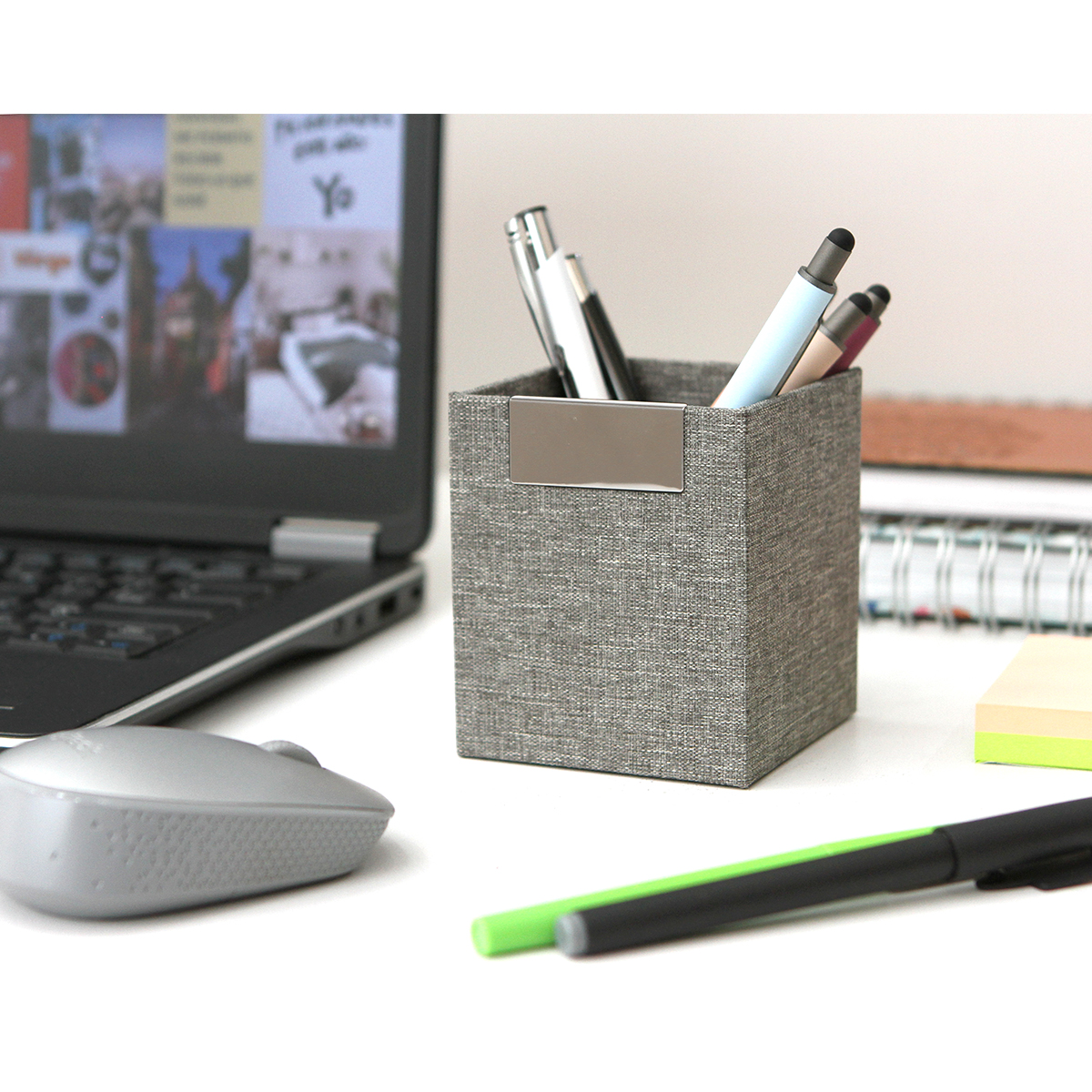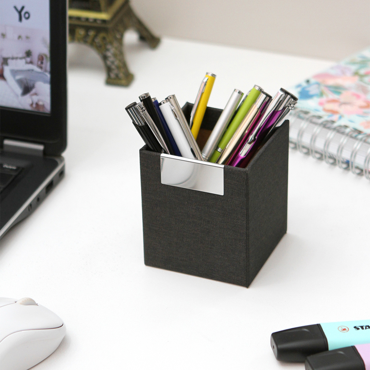 Portalápices Cerasella. - Portalápices de diseño cuadrado fabricado en material RPET 300D, con detalles cromados.