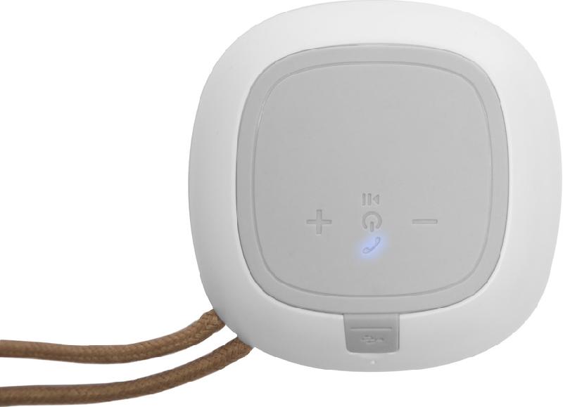 BOCINA BLUETOOTH "LÉUCADE" Bocina bluetooth cubierto en tela. En la parte inferior engomado antideslizante con botones para encender o apagar, play/pausa y responder llamadas. Botón de retroceso y avance, este último, si se mantiene presionado durante unos segundos pasa al siguiente sonido, estos mismos botones permiten aumentar o disminuir el volumen. Entrada USB incluye cable. Lazo de tela color marrón que permite colgarlo. Duración de la batería 8 - 12 hs aprox.