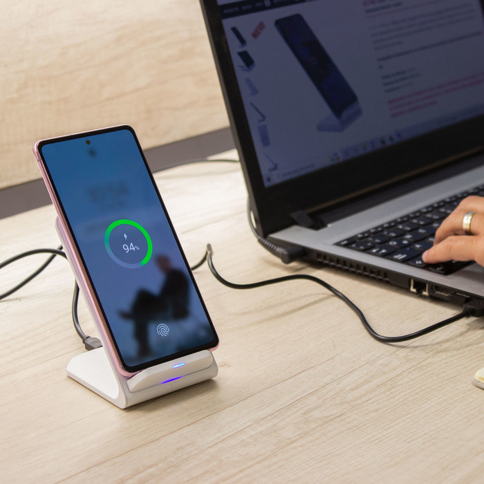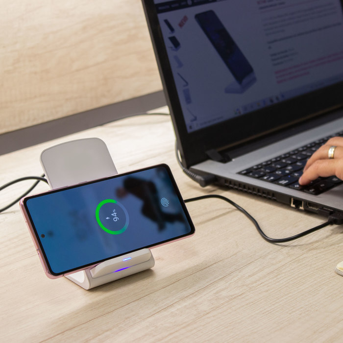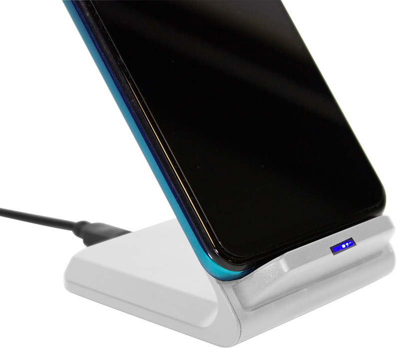 CARGADOR ¨KINGWI¨ Cargador USB de carga rápida inalámbrica para telefono móvil. Apoyando el celular comienza a cargar la bateria. Puede cargarse tanto en posicion horizontal como vertical gracias a la doble bateria de 10w c/u. Incluye cable de conexión USB de 60cm de largo. Presentación en caja de regalo. Compatible exclusivamente con celulares que permitan carga inalámbrica (tecnología qi). Voltaje de Entrada : 9V/2A Potencia de Salida:10W(MAX). Frecuencia:110-205Khz. IMPORTANTE: ESTE PRODUCTO SOLO PERMITE GRABADO LASER SOBRE LA VERSION DE COLOR BLANCA. NO ES POSIBLE EN EL COLOR NEGRO POR CUESTIONES DE REGISTRO Y CONTRASTE DE COLOR.