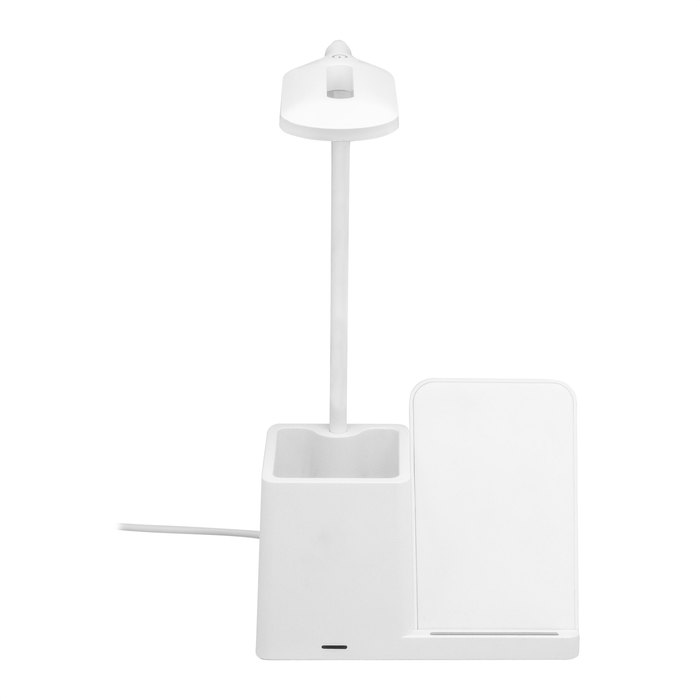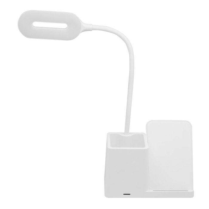 ORGANIZADOR DE ESCRITORIO CON LÁMPARA "MINIOFFICE" Lámpara de escritorio con portabolígrafos y cargador inalámbrico para teléfono móvil. Posee 3 modos de luz: cálida, fría y tenue. Cuello flexible. Carga rápida inalámbrica de 15w. Conector tipo USB-C. Presentación en caja de regalo.