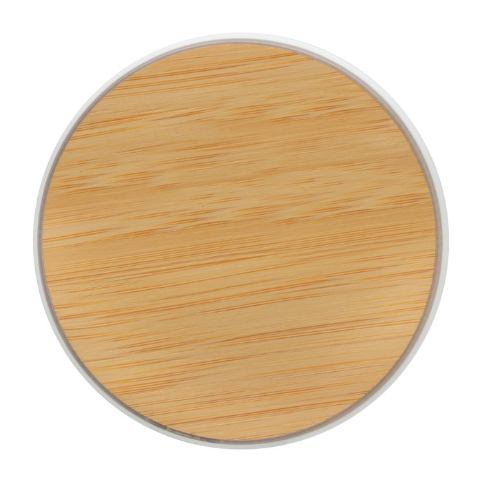 Cargador inalámbrico. Base plástica color blanco con antideslizantes. Entrada: 5V/2A, 9V/1.1A. Salida: 10 watts. Control de temperatura. Detección de objetos extraños. Luces indicadoras de carga. Cable de carga USB-C en color blanco de 50 cm de largo. Presentación en caja de regalo kraft.
