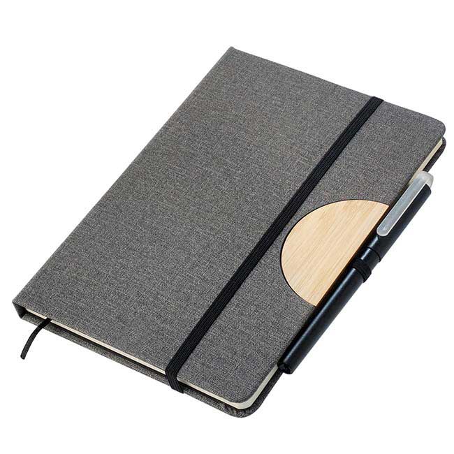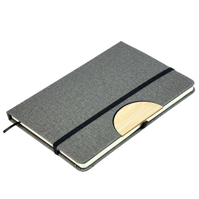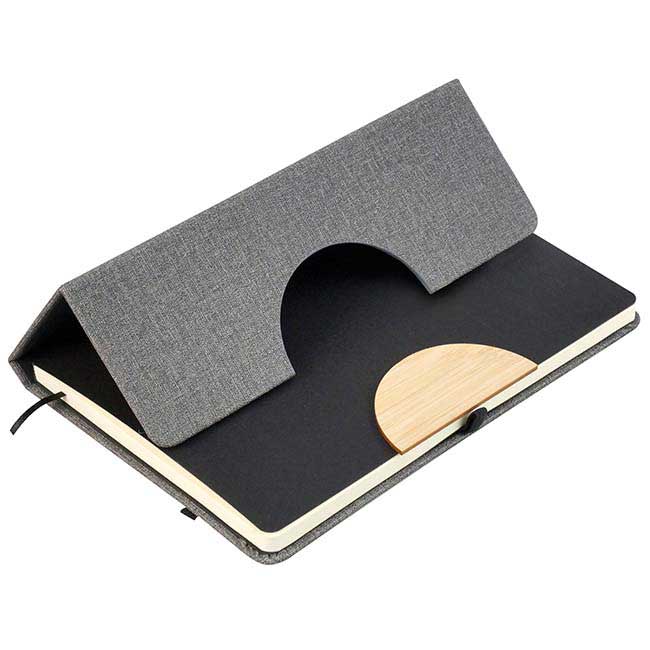 Libreta Véneto Detalle de bamboo en pestaña de cierre. Sistema para stand móvil y porta bolígrafo. Cinta divisoria. Aprox. 80 hojas rayadas. Color: Gris.