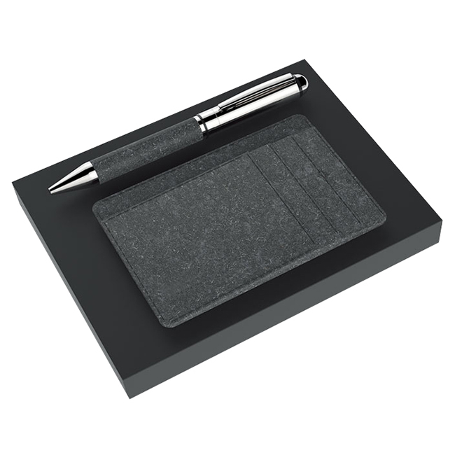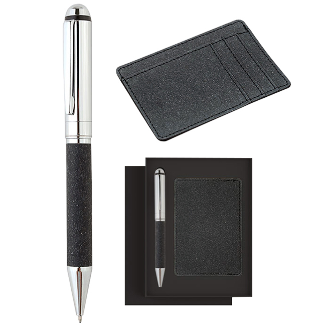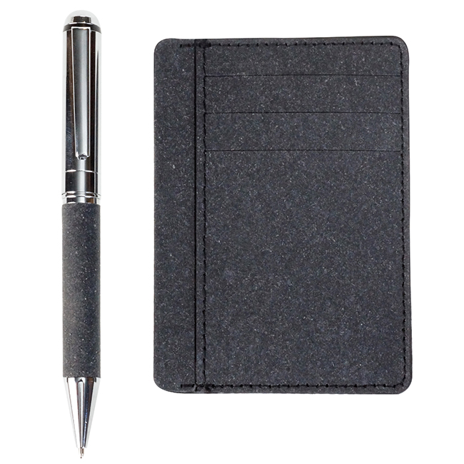 MATERIAL: Metal y PU reciclado MEDIDAS: Bolígrafo: 14 x 1 cm Portatarjetero: 11.5. x. 8 cm