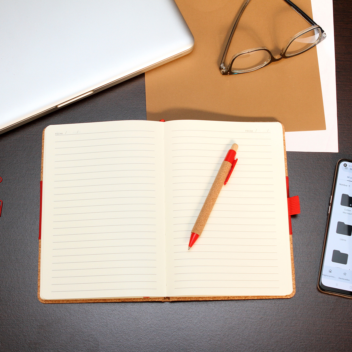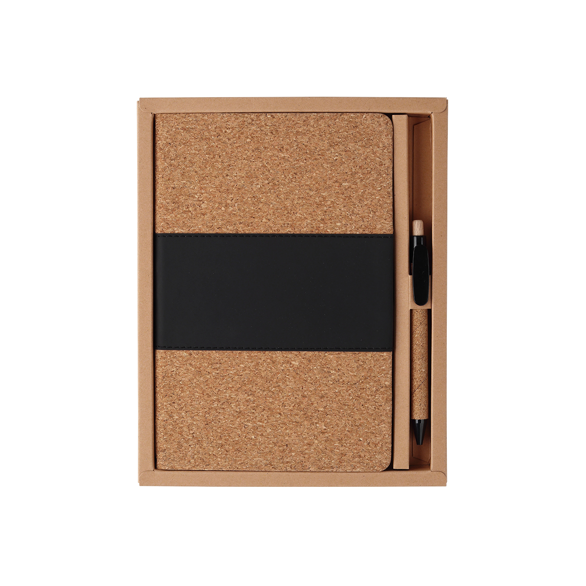 Set de libreta Delhi. - Set de libreta con pasta rígida de corcho y PU, 80 hojas rayadas de 70 g, separador de hojas y porta pluma; bolígrafo con barril de corcho, detalles en plástico y tinta de escritura negra. Incluye estuche de cartón individual. Tamaño A5.